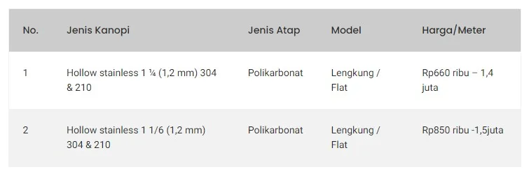 Kanopi hollow stainless steel hampir serupa dengan kanopi besi hollow. Proses pembuatannya relatif mudah, dan harganya juga terjangkau. Berikut adalah daftar harga terbaru untuk kanopi hollow stainless: