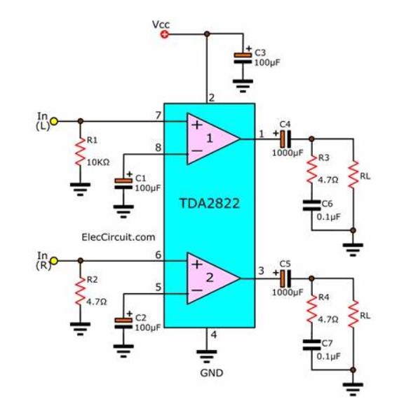 TDA2822 adalah komponen yang umumnya digunakan pada amplifier dengan daya rendah. Berikut adalah skema sederhana yang dapat kalian gunakan sebagai panduan dalam merakit amplifier:
